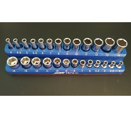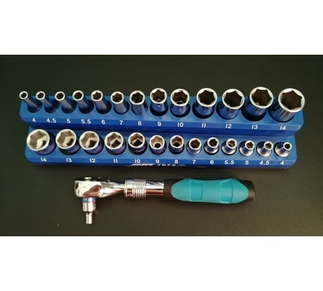 Неплохой набор торцевых головок. Есть пружинный держатель в комплекте. На каждой головке есть маркировка. Можно повесить на стену, если нужно.