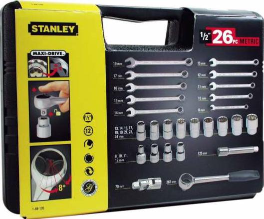 Набор торцевых головок 26 шт Stanley 1-89-105 состоит из большого количества различного инструмента, необходимого для ремонта автомобилей и других различных агрегатов как в бытовых условиях, так и в профессиональных сервисах и мастерских. Все компоненты укомплектованы в удобный закрывающийся чемодан с рукояткой, наличие которого снижает риск утери элементов.