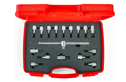 Набор торцевых головок IZELTAS 1/2", со вставками, 17 предметов 1113006017 поставляется в пластиковом чемодане для удобной транспортировки и хранения. Содержит в себе семнадцать предметов: девять головок со вставкой Torx, семь головок со вставкой Hex и один вороток.