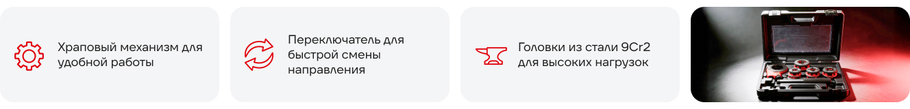 - 4 сменные головки размером 3/8" (10 мм), 1/2" (12,5 мм), 3/4" (19 мм), 1" (25 мм)