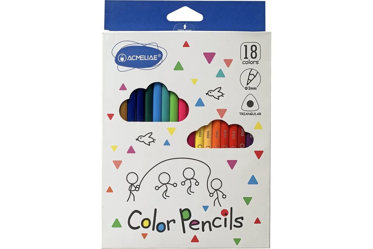 Набор цветных трехгранных карандашей ACMELIAE 18цв. в картонном футляре 9402-18 для детского творчества. Специальная проклейка грифеля для максимальной стойкости к поломкам - важно для маленьких детей. Яркие красивые натуральные цвета не размываются водой, не выцветают, оставляют руки и одежду ребенка чистыми, легко наносятся, рисунки получаются живые. Корпус из древесины тополя ровно аккуратно затачивается. Трехгранный корпус удобен для правшей и левшей, снижает усталость руки и прививает навык правильно держать карандаш. Длина карандаша 175мм. Диаметр грифеля 3мм. Карандаши идеальны для малышей от 3-х лет. Качество соответствует европейским стандартам EN71 (требования ЕС к игрушкам) и REACH (отсутствие вредных веществ). Многослойное лаковое покрытие – идеальный внешний вид карандашей. Экологичны: используется древесина сертифицированных и специально подготовленных лесов. Детские и школьные карандаши - отличный подарок в школу мальчикам девочкам, на 1 сентября первокласснику, в дорогу, на выпускной в детском саду.