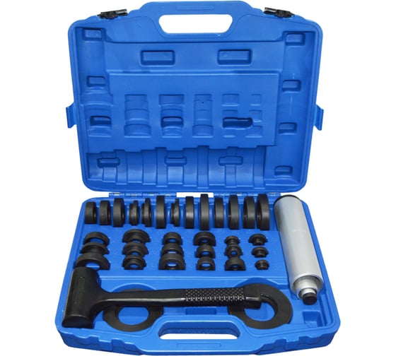 Набор оправок для выпрессовки (демонтажа) и запрессовки (монтажа) подшипников, втулок и сальников в комплекте с молотком резиновым без отдачи (безынерционным) 38 предметов. Оправки размером от 26 мм до 110 мм. Правильная комбинация ударной оправки и втулки обеспечивает оптимальную передачу монтажного усилия на кольцо подшипника, установленного с натягом, исключая повреждения.