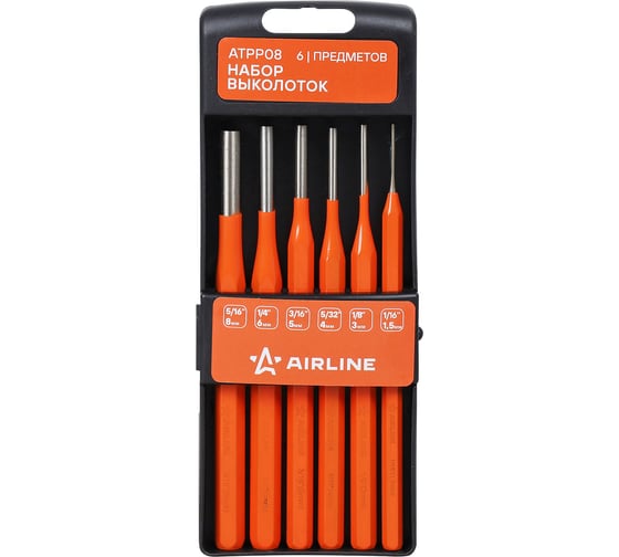 Набор выколоток 6 пр. 1.5-8мм, холдер AIRLINE ATPP08 Набор (6 предметов) предназначен для выдалбливания отверстий, выбивания пазов и извлечения элементов крепежа, таких как шпильки, штифты и пробки, из различных материалов. Инструменты выполнены из высококачественной стали, которая обладает повышенной твердостью, стойкостью к ударным нагрузкам и износу. Набор включает выколотки диаметром 1.5, 3, 4, 5, 6 и 8 мм и оснащен удобным пластиковым держателем для безопасного хранения и предотвращения потери инструментов. Рекомендуется для профессионального использования благодаря высокой прочности, долговечности и устойчивости к внешним воздействиям.