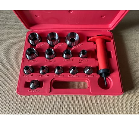Большой выбор диаметров, хорошо заточен. центровка для изготовления прокладок (её можно легко снять), жесткий кейс.