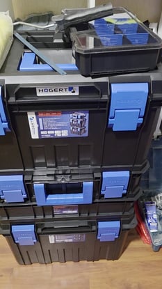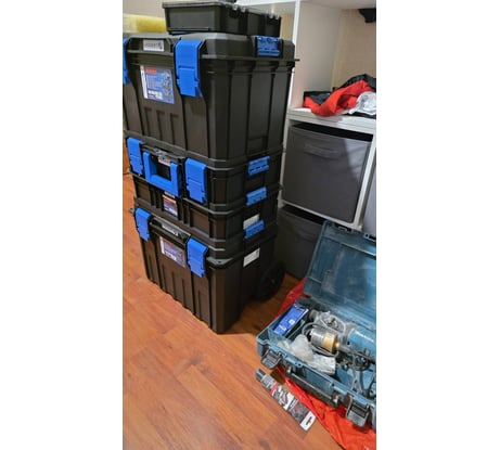 Классный ящик, конкурентов в эту цену нет) колеса катаются на металлических осях, ручка прочная, застежки не слетали. Спокойно встаю ( во мне около 100 кг) на два нижних, хоть отдельно, хоть друг на друге если стоят, и не важно груженные при этом ящики или нет)) это радует) достаточно ребер жескости. Отдельно порадовало наличие переставных перегородок из которых можно сделать секции внутри больших ящиков. Два маленьких органайзера также позволяют разместить всякую медлочь и тоже встают в пазы внутри больших ящиков. Большой органайзер стоит на балконе под разные шурупы))