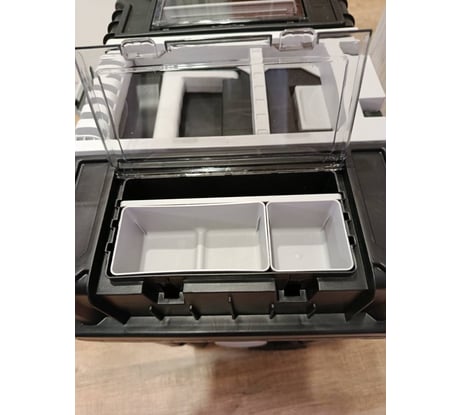 Этот ящик отличается герметичной прокладкой, которая защищает содержимое от пыли и влаги, что особенно важно для работы в сложных условиях. Две ручки – для переноски и транспортировки – добавляют удобства при использовании, а прозрачная крышка органайзеров из прочного поликарбоната помогает быстро увидеть, что находится внутри.