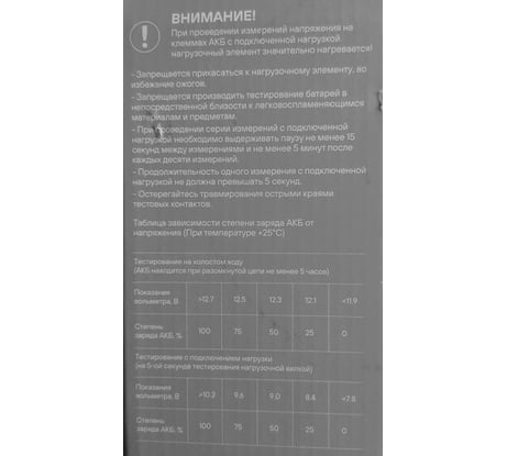 Полезный прибор, для нечастого периодического использования вполне удачный вариант, тем более, что стоит он не дорого. С этой вилкой не сложно определить состояние аккумулятора и уровень его заряда. По крайней мере вы поймете, что емкость у аккумулятора уже не та и его скоро придется менять. Какие особенности. На шкале вольтметра нанесены специальные знаки, не на всех вольтметрах такого уровня они есть. Согласно знакам, это вольтметр постоянного тока, с рамкой, погрешность измерения 2,5%, испытательное напряжение 2кВ, прибор применять при вертикальном положении шкалы. Но мы то будем проверять аккумулятор так, что шкала будет в горизонтальном положении. А разница в показаниях при этом, составит 1,0 В. Если стрелку выставить строго в НОЛЬ, то до 6В показания будут точными, а вот при 12В показания будут занижены на 0,2В. Пусть это и неправильно, но я откалибровал вольтметр в горизонтальном положении на 12В. При этом стрелка, при отсутствии напряжения, показывает 0,2 В. Мне важен диапазон 8-13В. Сопротивление нагрузки составляет 0,10 Ом. При 10В ток нагрузки будет 100А, при 6В - 60А, так что можно проверять и 6В аккумуляторы, тем более, что и емкость у них меньше. С электронными вольтметрами конечно проще, но если рассматривать недорогие варианты, то и они подвирают, а вот калибровка в них уже не предусмотрена. Что касается качества, собран просто, но аккуратно, провод жесткий, крокодил хороший. Из минусов, лента нагрузки выступает за пределы корпуса, нагревается сильно, надо быть осторожным. В целом прибор оправдал ожидания.