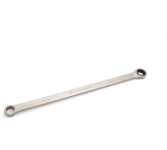 Удлинённый накидной ключ из хромованадиевой стали с надёжным 72-зубцовым храповым механизмом. Ускоряет отворачивание и заворачивание крепежа в условиях ограниченного пространства. Применяется при работе со шкивами, радиаторами охлаждения, а также при обслуживании элементов подвески и рулевого механизма. Незаменим в случае, когда длина обычного накидного ключа не позволяет развить необходимое усилие, а для использования торцевых головок недостаточно рабочего пространства. Трещоточная часть ключа не предназначена для страгивания и силовой протяжки крепежа, для этого применяется накидной профиль ключа или торцевые головки. Размер: 18 мм Длина: 415 мм Сталь: 6140CrV Твёрдость: 44—48 HRC Никелирование