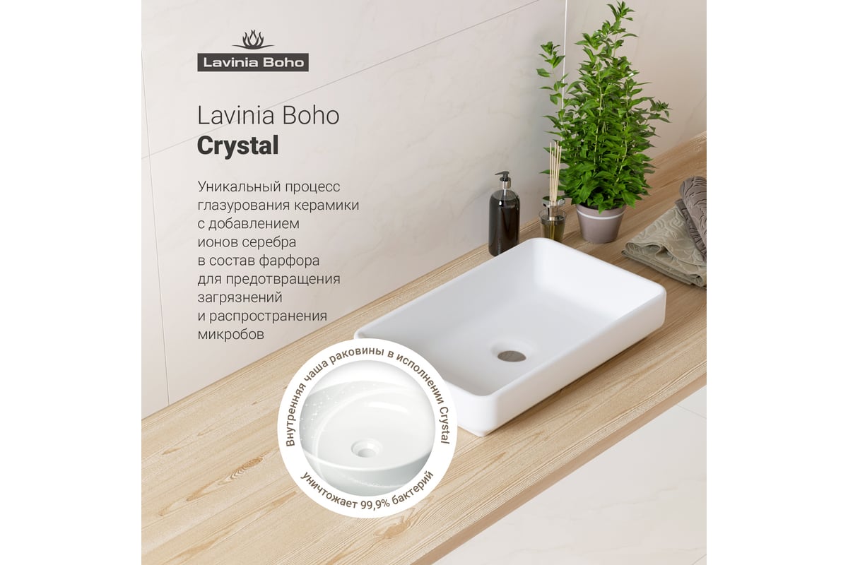 После обжига керамики при температуре 1250°С образуется плотная трехслойная фарфоровая структура, которая придает умывальнику прочность, сохраняет безупречную белизну внутренних и внешних поверхностей. Грязеотталкивающее покрытие с ионами серебра препятствует образованию налета и размножению патогенных бактерий. Дизайнерская раковина Lavinia Boho отлично гармонирует с надежной водосливной арматурой Drainage System от Wellsee.