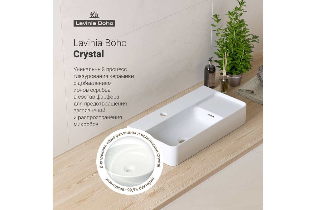 После обжига керамики при температуре 1250°С образуется плотная трехслойная фарфоровая структура, которая придает умывальнику прочность, сохраняет безупречную белизну внутренних и внешних поверхностей. Грязеотталкивающее покрытие с ионами серебра препятствует образованию налета и размножению патогенных бактерий. Дизайнерская раковина Lavinia Boho отлично гармонирует с надежной водосливной арматурой Drainage System от Wellsee.