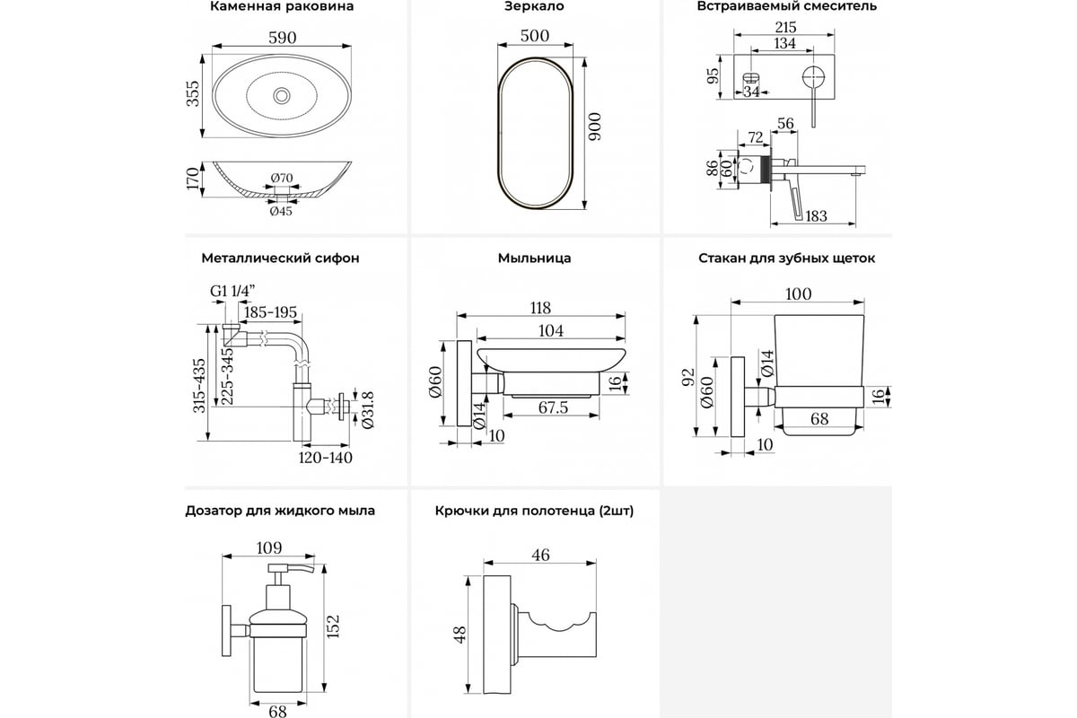 Накладная раковина для ванной Wellsee Le.huit.mars в наборе 9 в 1: раковина из камня цвет матовый белый, встраиваемый смеситель, сифон, аксессуары 5 шт, зеркало (цвет набора матовый черный) 202000301