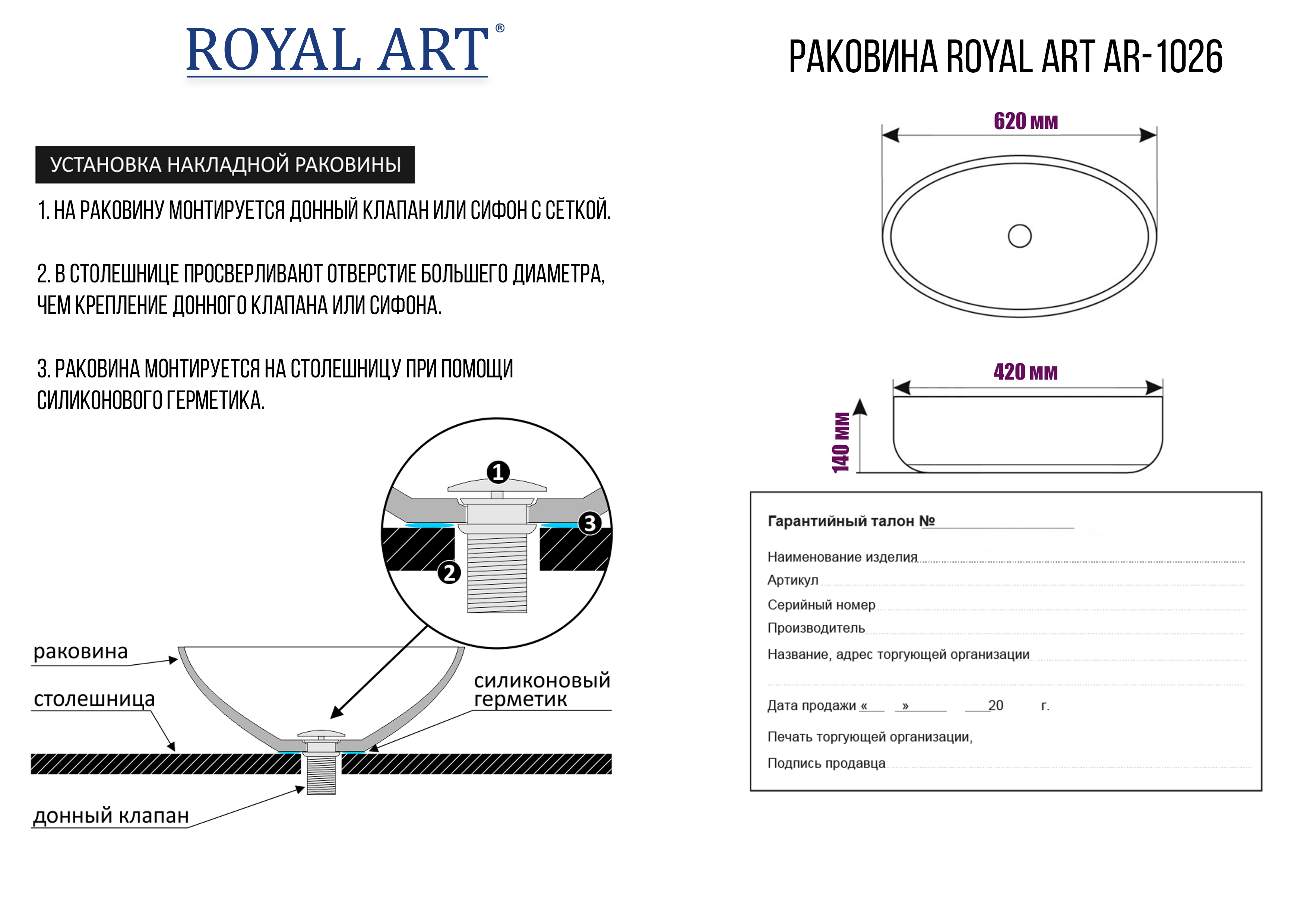 Накладная раковина ROYAL ART AR-1026 изготовлена из фарфора высокого качества.