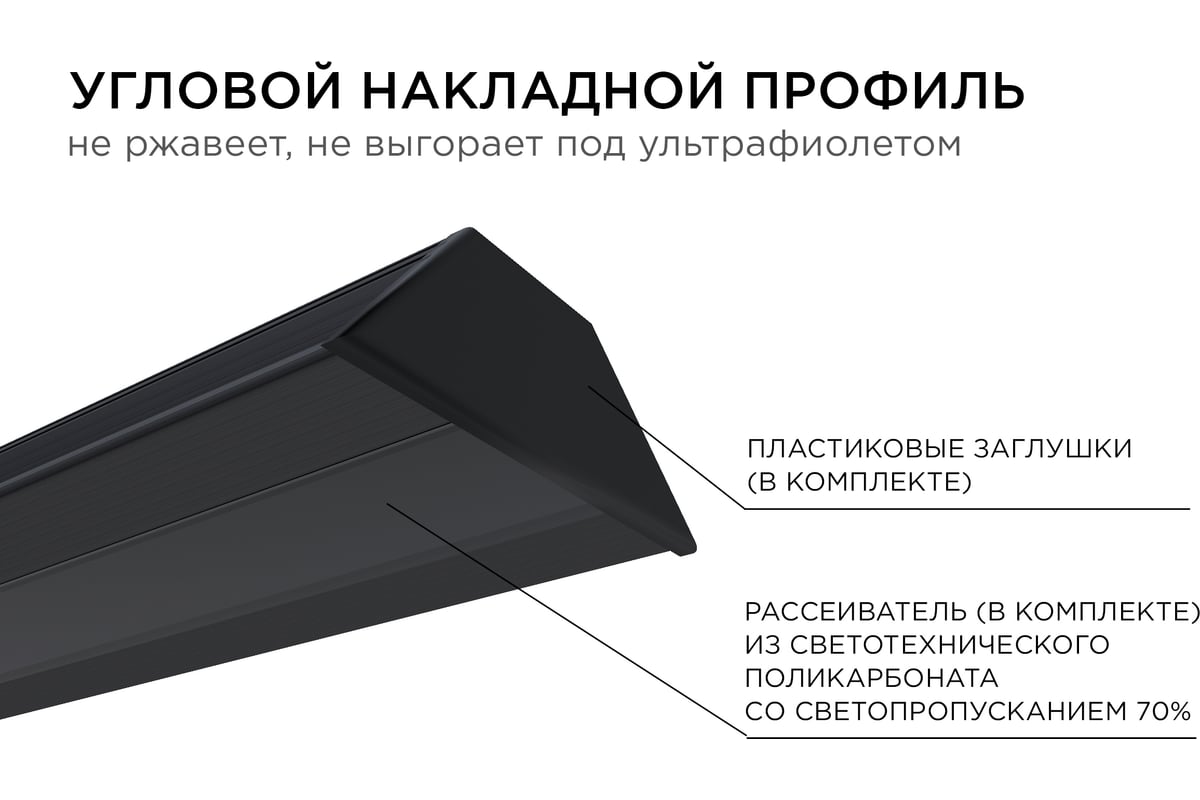 В профиль уже установлен рассеиватель черного цвета, изготовленный из светорассеивающего поликарбоната. Такой рассеиватель пропускает 23% светового потока и делает его более мягким и приятным для ваших глаз, но в то же время не искажает передаваемые оттенки свечения и наиболее часто используется для организации декоративного освещения.