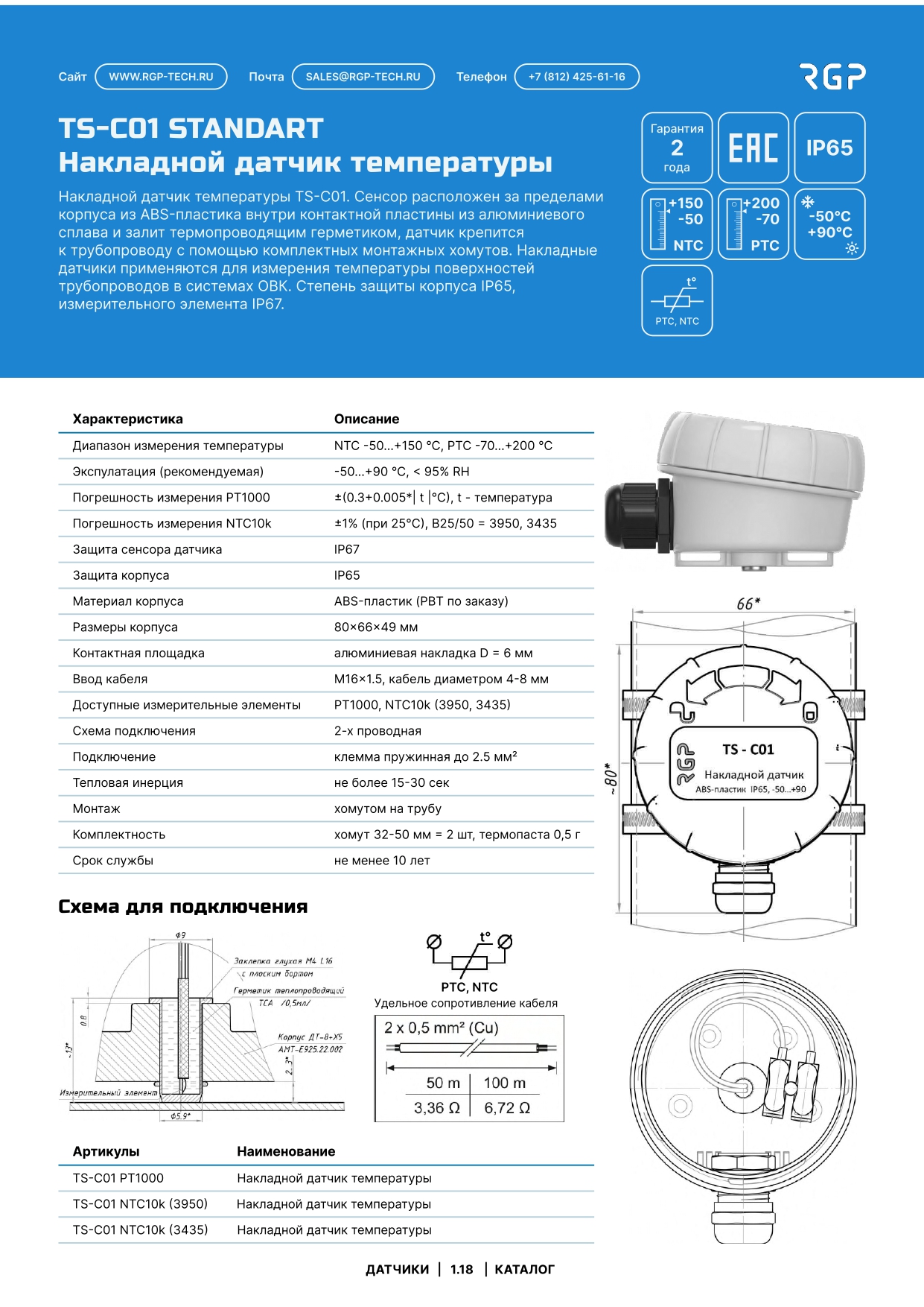 TS-С01: Накладной датчик температуры с контактной площадкой из алюминиевого сплава диаметром 6 мм. снабжен 2 крепежными прорезями для монтажных хомутов, крышкой на резьбовом соединении и съемными клеммами для подключения к системе управления и автоматизации. Использование контактной площадки из сплава дает увеличение точности показаний по сравнению с тонкостенными гильзами до 10%.