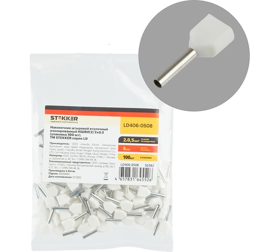 Наконечник штыревой втулочный изолированный STEKKER LD406-0508 НШВИ(2) 0,5-8 (упаковка 100 шт), 50382