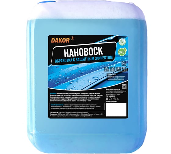 DAKOR® Нановоск — инновационное высокоэффективное полимерное средство для финишной обработки кузова автомобиля. После нанесения формирует тонкую наноплёнку с выраженным гидрофобным эффектом: вода быстро скатывается, а поверхность дольше остаётся чистой. Средство усиливает блеск и глубину цвета, придаёт кузову гладкость, а также обеспечивает антистатические и грязеотталкивающие свойства.
