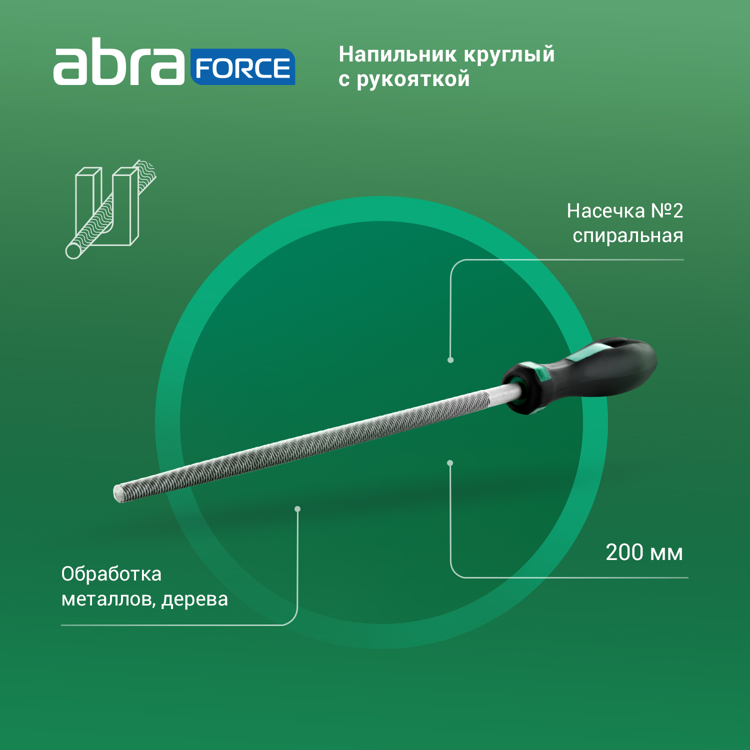 Напильник ABRAforce круглый с рукояткой 200 мм спиральная насечка №2 (спиральная/универсальная)- 1штука. Многолезвийный инструмент для обработки металлов, дерева и других твёрдых материалов.