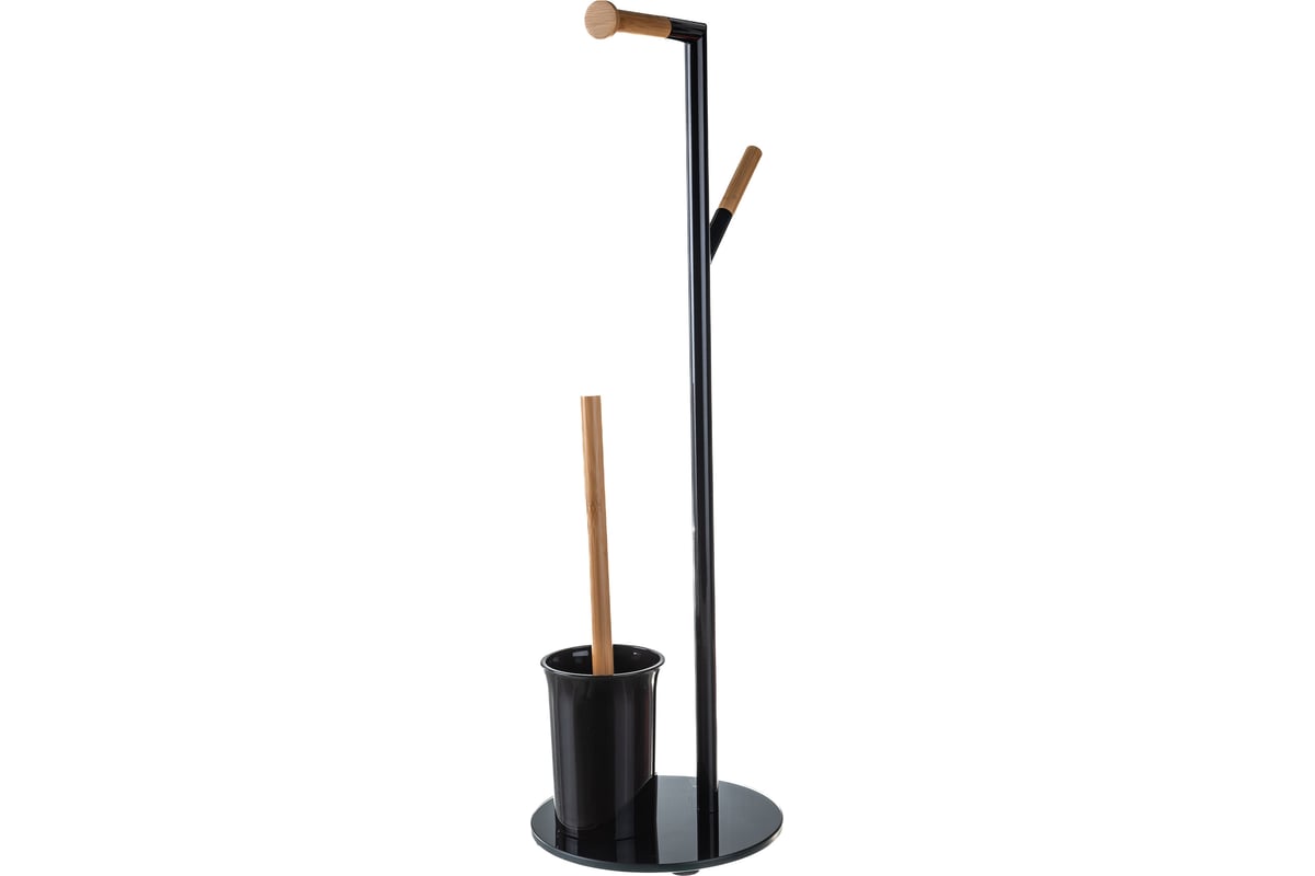 Каркас выполнен из металла и дополнен деревянными элементами - держателем для туалетной бумаги и накопителем для запасного рулона. Ограничитель на держателе для туалетной бумаги удерживает рулон в нужном положении, препятствуя его соскальзыванию и разматыванию.