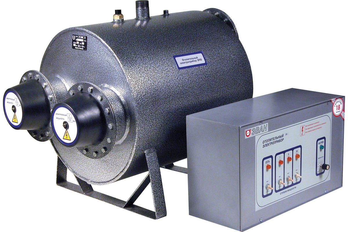 Электрический котел Эван ЭПО-108 предназначен для отопления производственного помещения. В комплекте поставляется пульт управления. Мощность устройства можно ступенчато регулировать, контролируя текущую температуру нагрева. Система нагрева представляет собой блок, состоящий из высокомощных ТЭНов, которые выдерживают высокую нагрузку. В данной системе используется термодатчик, не позволяющий повышаться температуры нагрева выше 92 градусов. При регулировке температуры мощность котла остается неизменной