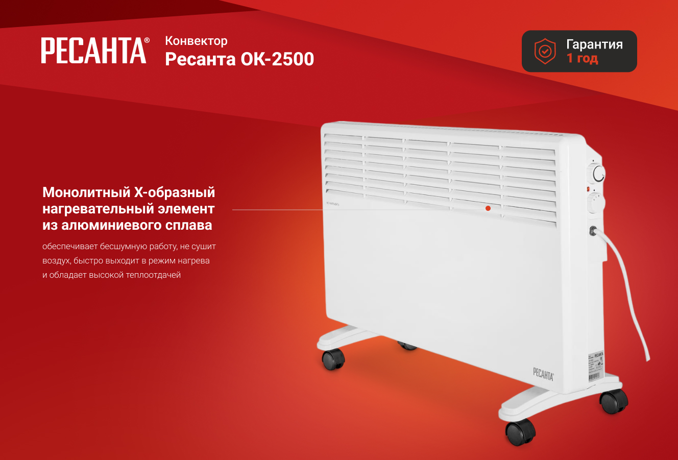 Надёжный, компактный, простой в управлении и эксплуатации электроконвектор Ресанта ОК-2500 является самым мощным в серии «ОК». Он оснащён монолитным Х-образным нагревательным элементом, конструкция которого сводит к минимуму промежуточные теплопотери и обеспечивает практически моментальный выход на установленный режим нагрева. Работает он бесшумно, без щелчков и других звуков во время нагрева или остывания. По сравнению с обычными ТЭНами, Х-образные монолиты более долговечные.
