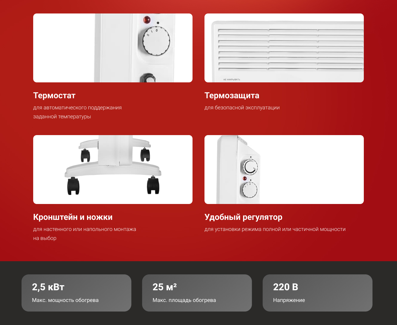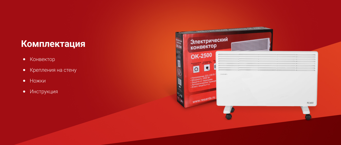 Конвектор имеет терморегулятор, может работать на двух мощностях 1.25 и 2.5 кВт и рассчитан на обогрев помещения площадью до 30 м2. Органы управления удобно расположены на боковой части конвектора. Питание осуществляется от обычной бытовой сети 220 В, 50Гц. Сетевая вилка в комплекте. Электроконвектор Ресанта ОК-2500 получил систему термозащиты. Прибор может устанавливаться на полу или монтироваться на стену. Для напольной установки в комплекте конвектора имеются специальные опоры с колёсами, а для настенного крепления – набор крепёжных элементов. Класс защиты от воды и пыли – IP 24.
