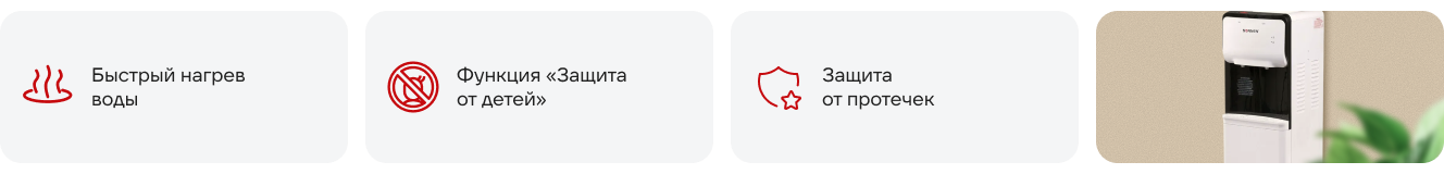 Кулер работает отлично! Горячая вода нагревается очень быстро, а холодная всегда освежает в жару. Дети в офисе в безопасности благодаря защите. Рекомендую!