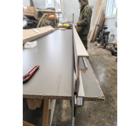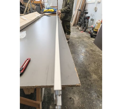 Самая дешёвая трёхметровая шина под Festool, Makita, AEG, Triton, Зубр и т.п. Взял из наличия, видимо отказная, т.к. была повреждена упаковка. По отзывам, прочитанным на тот момент, знал, что всё приклеено тяп-ляп. Алюминиевый профиль ровный, цена невысокая. Теперь надо найти, на какой клей всё склеить. На шине Triton, противоскольная лента приклеенная на двусторонний 3M, отклеивается по краям. Храню на прищепках))).