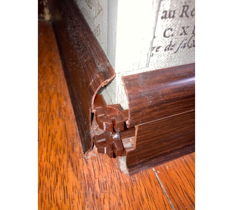 Отсутствие инструкции. Сначала нужно согнуть крепёжную основу в сторону, где механизм основы защёлкивается. Затем по стрелкам на основе определить верх. С соблюдением положения верх/низ по очереди вставить основу в участки плинтуса, в моём случае один участо пришлось немного отогнуть. Основа фиксируется за все три полости плинтуса. Затем сверху надвинуть сам уголок.