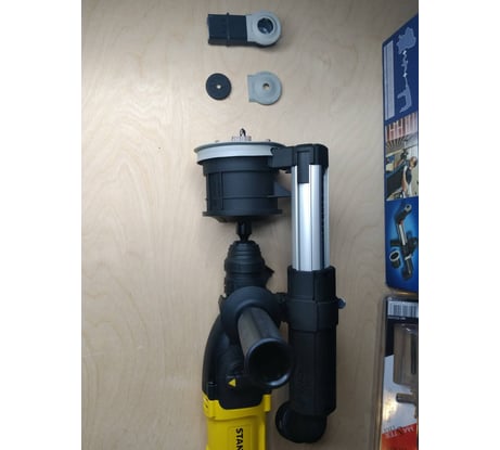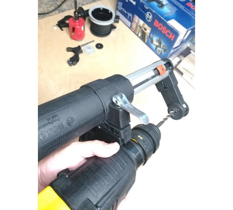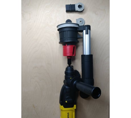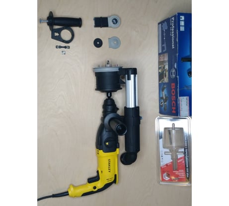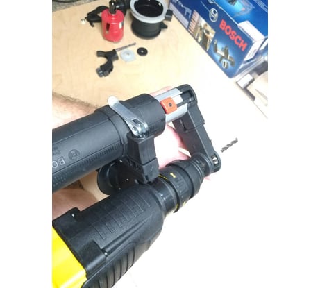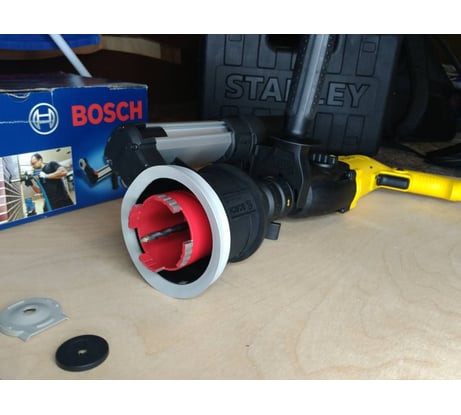 Не совместима с перфораторами Stanley и Dewalt требуется доработка см.фото. Есть стопор - ограничитель глубины пропила, регулятор вылета аппарата регулируемые что позволяет использовать буры до 200мм(не понятно почему производитель заявляет всего до 100мм). Патрубок выхода комбинированный 35мм(Bosch 46mm) подошёл стандартный шланг удлинитель Einhell до циклона пылеуловителя, в целом работать удобно насадка лёгкая. Требуется несложная доработка крепления т.к. родное Bosch диаметром 44мм, а на моём Stanley 48mm посадочное для крепления ручки. Испытание с буром 15мм прошли успешно пыли на контрольную площадку выпало минимум. Всем советую аппарат к приобретению, цена ~6500? на июль 2021г.