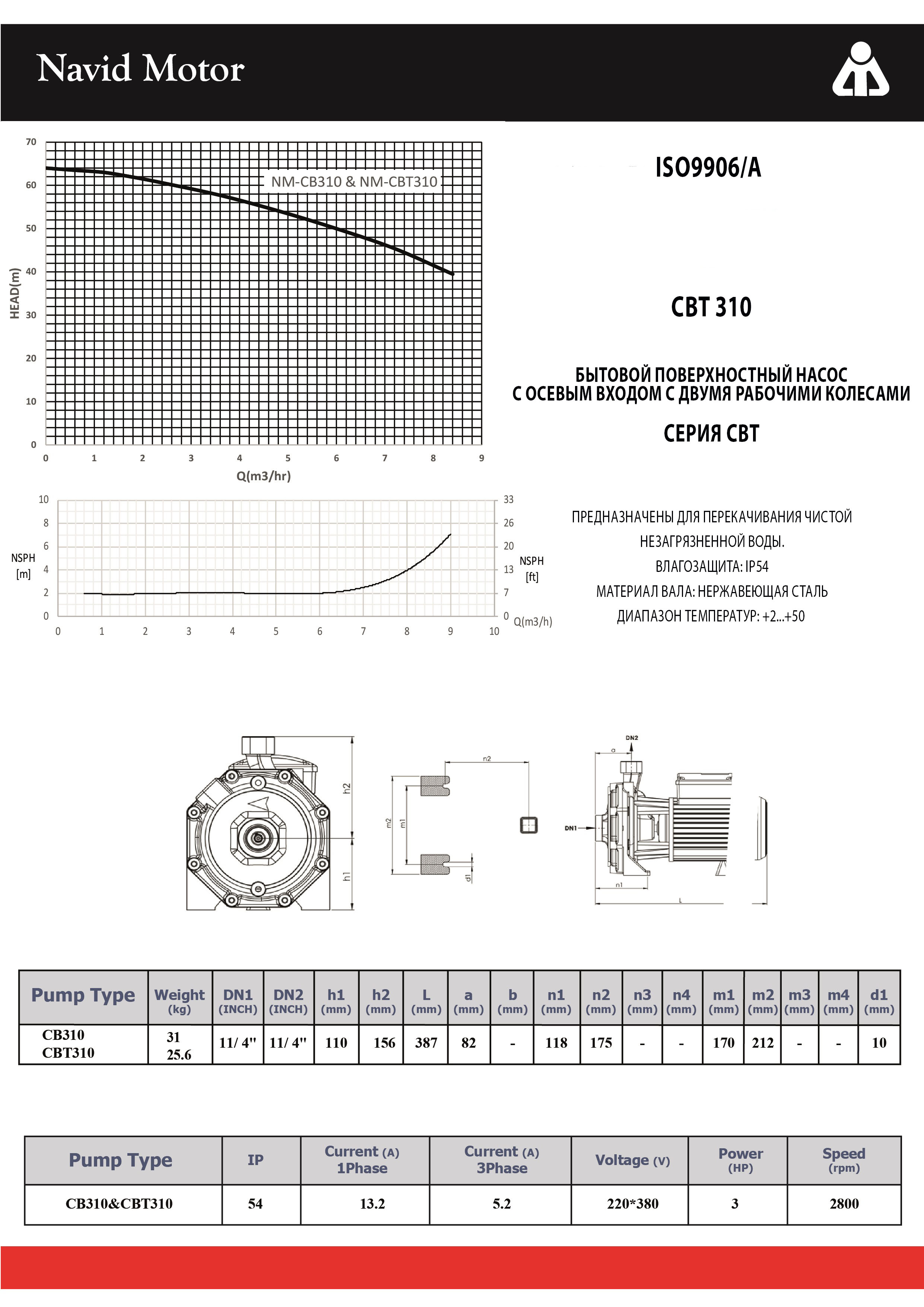 Центробежные насос CBT 310 с двумя противоположными крыльчатками, с осевым всасывающим отверстием и радиальным всасывающим отверстием, обращенным вверх, используются при это требует достижения высокой распространенности, особенно для промышленного, сельскохозяйственного и домашнего использования. При использовании этих электронасосов рекомендуется использовать жидкости химически и механически очищены, с температурой не выше 50 °С. Насос: Насос с горизонтальной осью с радиальным рабочим колесом из латуни закрытого типа, корпус насоса и опора из чугуна G20, вал из нержавеющей стали AISI 304 и механическое уплотнение из керамика / графит.