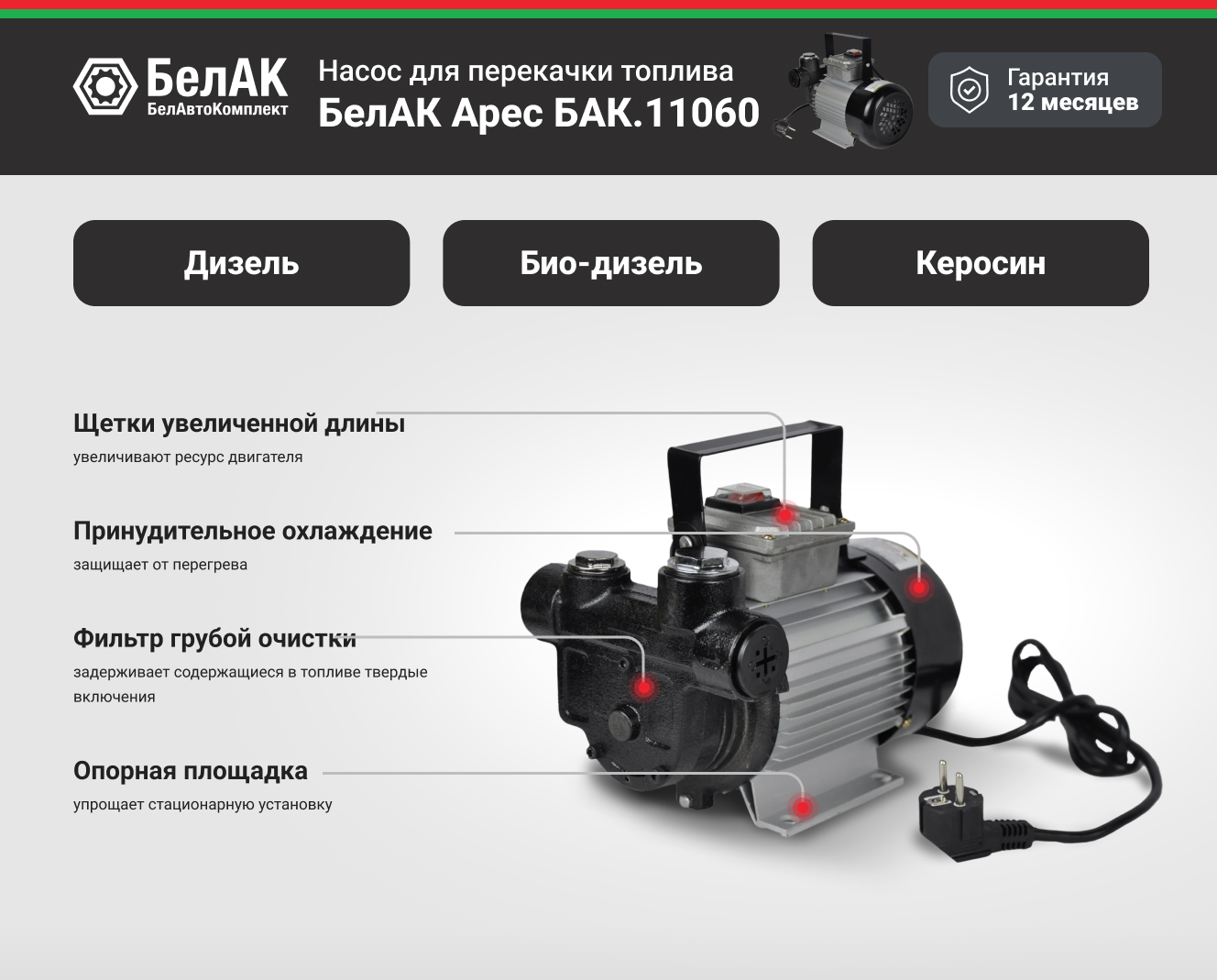 Насос перекачки топлива 220 V 60 л/мин БелАК Арес БАК.11060 предназначен для перекачки дизельного топлива и керосина из различных ёмкостей. Насос идеально подойдет для мобильной перекачки топлива в полевых условиях.