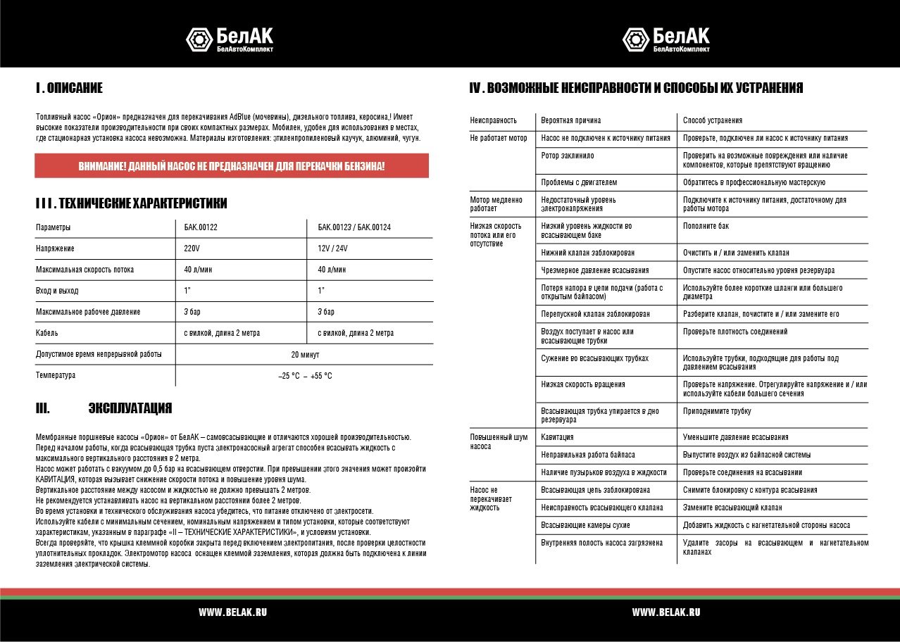 Технические характеристики насоса БелАК ОРИОН 24V БАК.00124