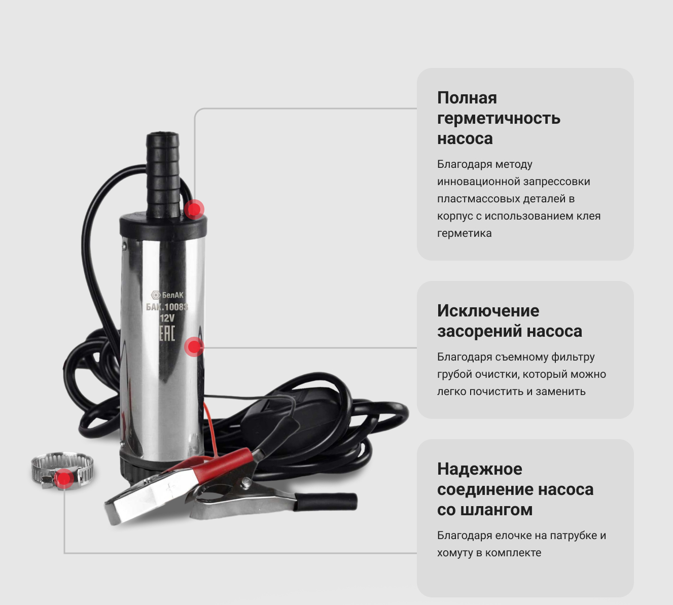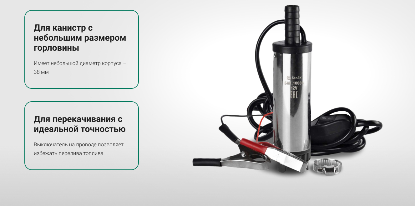 Все модели погружных насосов перекачки топлива бренда «БелАК» имеют фильтр очистки топлива. Насос для ГСМ оснащен специальной «елочкой» на патрубке, в комплекте хомуты для шланга, что гарантируют надежное крепление шланга к насосу. Наличие на нижней части насоса специальных ножек исключают присасывание ко дну емкости во время перекачки топлива.