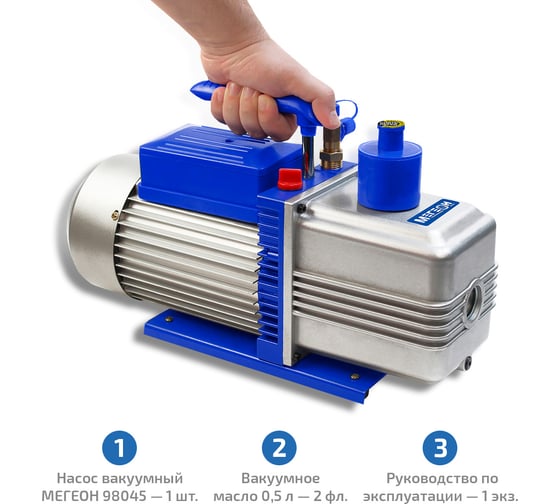 МЕГЕОН 98045 – это техническое средство представляющее собой электрический вакуумный двухступенчатый масляный насос, сочетающий в себе небольшие размеры, вес, высокую производительность и беспрецедентную надёжность. Удобная ручка для переноски, низкий уровень шума и невысокое энергопотребление делают его весьма привлекательным приобретением. Исключительные эксплуатационные характеристики достигаются благодаря новейшим разработкам, высококачественным материалам и изготовлению деталей на прецизионных станках. Он найдёт широкое применение при монтаже, наладке и ремонте бытового и торгового холодильного оборудования, домашних и автомобильных кондиционеров, в исследовательской деятельности и промышленном использовании, где необходимо откачать воздух до абсолютного значения 0,3 паскаля.