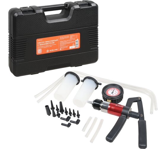 Насос вакуумный с манометром для прокачки тормозной системы AIRLINE набор 20 предметов, кейс ATBT202