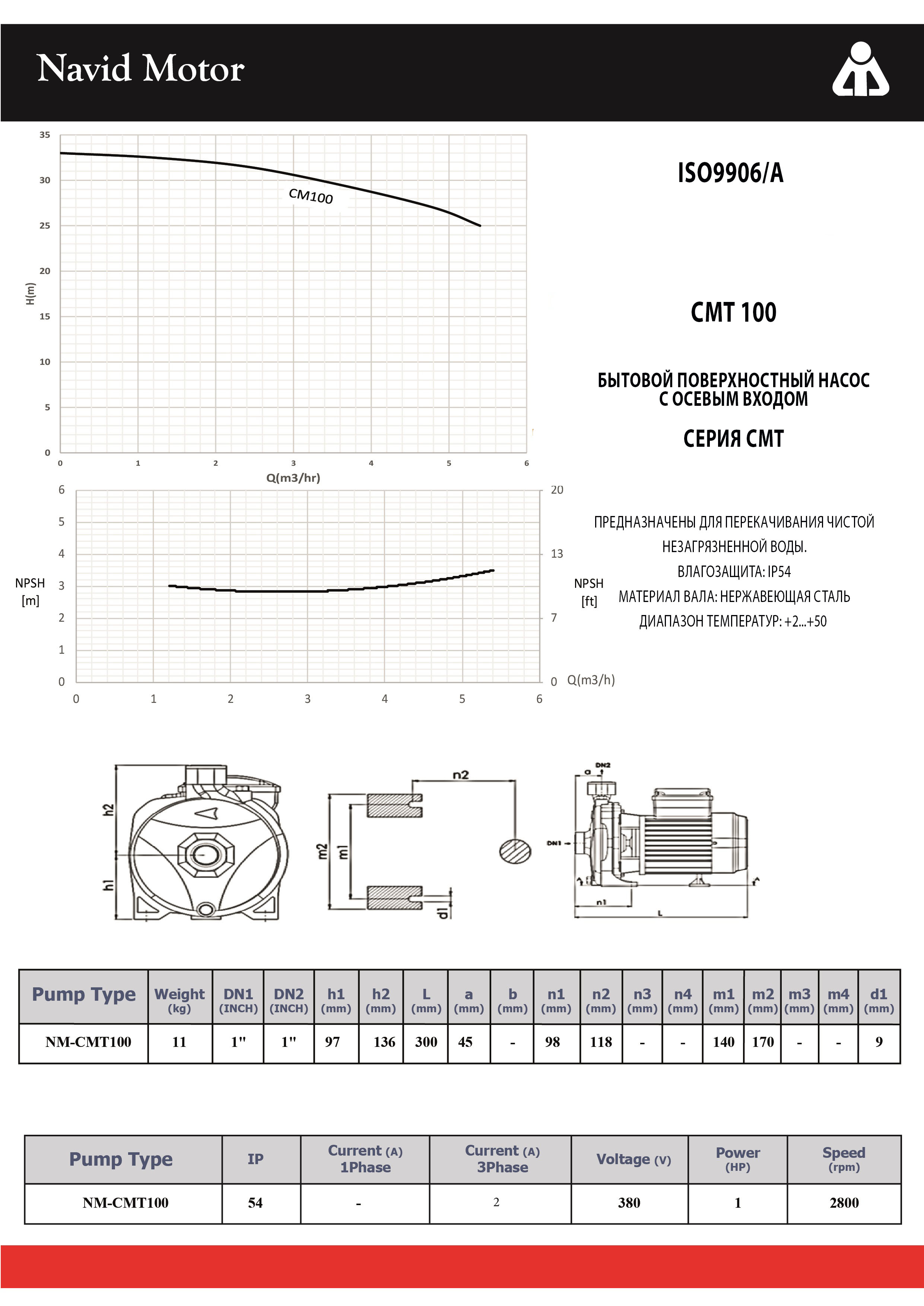 Насос вихревой NAVIDMOTOR (1 HP) CMT 100 дв 0,75 квт 380В