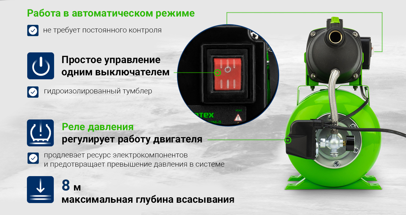 Автоматический контроль воды. Реле давления включает и выключает насос в зависимости от давления воды в системе.