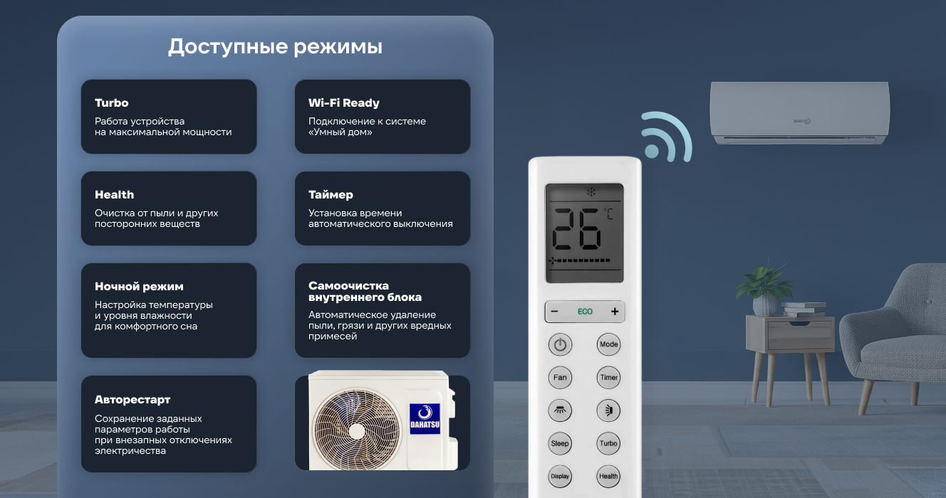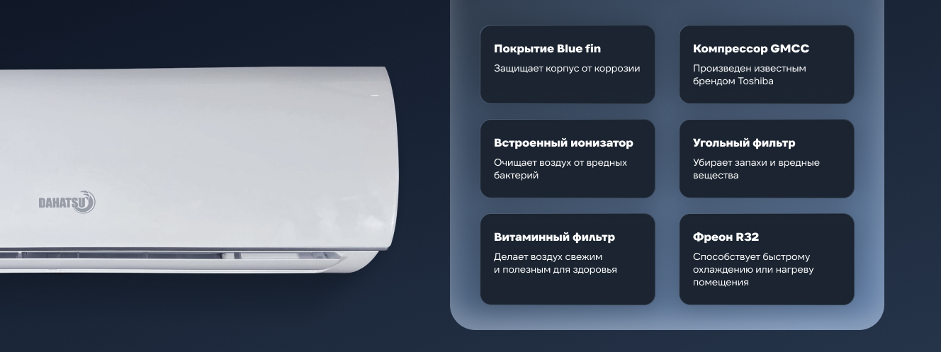 Сплит-системы Dahatsu серии Onyx оснащена Blue hydrophilic fin покрытием, которое славится своей надежностью и долгим сроком службы. В кондиционерах представлена функция авторестарта, сохраняющая заданные параметры работы при внезапных сбоях в электроснабжении.