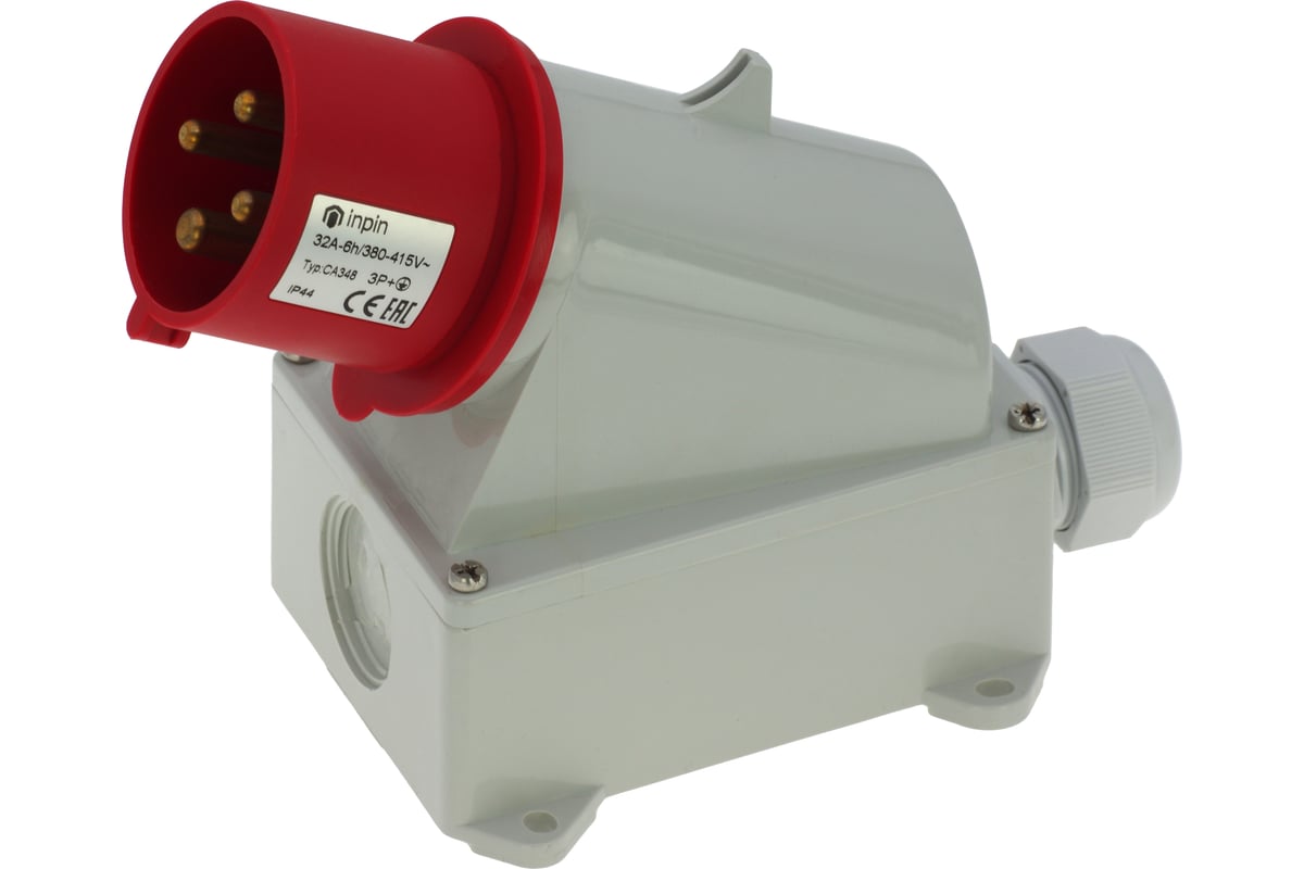 Настенная вилка INPIN 32A/400V/3P+E/IP44 CA348 адаптирована для промышленности, добывающих и перерабатывающих предприятий, а также подходит для эксплуатации в неблагоприятных условиях.