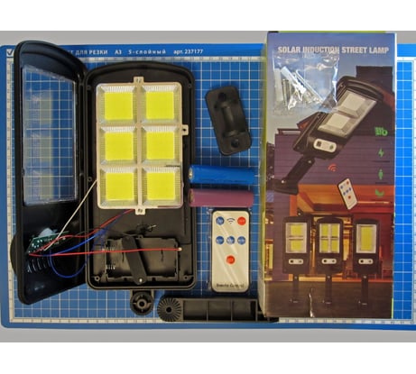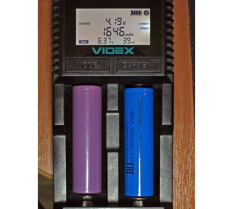 Пульт. Три режима яркости. Работает от двух съёмных аккумуляторов (в моём экземпляре аккумуляторы были из разных партий: первый - в фиолетовой термоусадке с плоским плюсовым контактом, второй - в синей термоусадке - с выпуклым плюсовым контактом) - см. фото 1