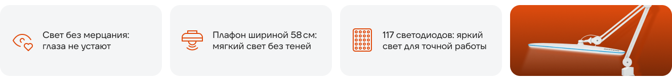 Широкий плафон размером 58 см обеспечивает освещение широкой рабочей зоны без мерцания и пульсации, а также создает направленный световой поток без отбрасывания тени.