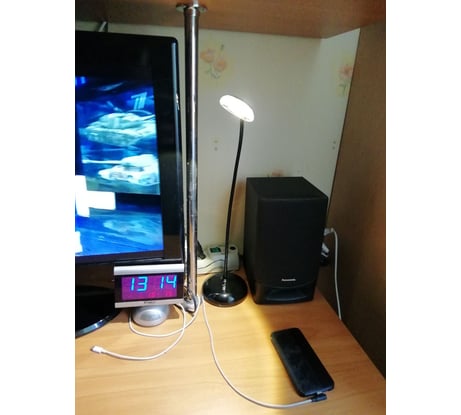 Длинная гибкая ножка, крути как хочешь. Тяжёлое устойчивое основание. Свет тёплый, для моих нужд (подсветка зоны у телевизора и пр. аппарат.) более чем достаточно.