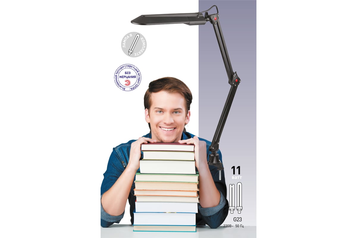 Настольный светильник ЭРА NL-201-G23-11W-BK, черный C0041456 предназначен для использования с энергосберегающей лампой, которая обеспечивает экономию электроэнергии до 70%. Лампа входит к комплект. Удобное крепление на струбцину к любой плоской поверхности. Выключатель на основании плафона. Высота плафона регулируется двухсекционной сгибающейся стойкой, направление света регулируется поворотом плафона в любом направлении под любым углом. Как и все светильники ЭРА с лампой PL, модель укомплектована ЭПРА (электронным пускорегулирующим аппаратом), обеспечивающим ровный свет без мерцания. Для использования с энергосберегающей люминесцентной лампой, имеющей следующие характеристики: мощность 11W цоколь G23 220V 50HZ лампа в комплекте