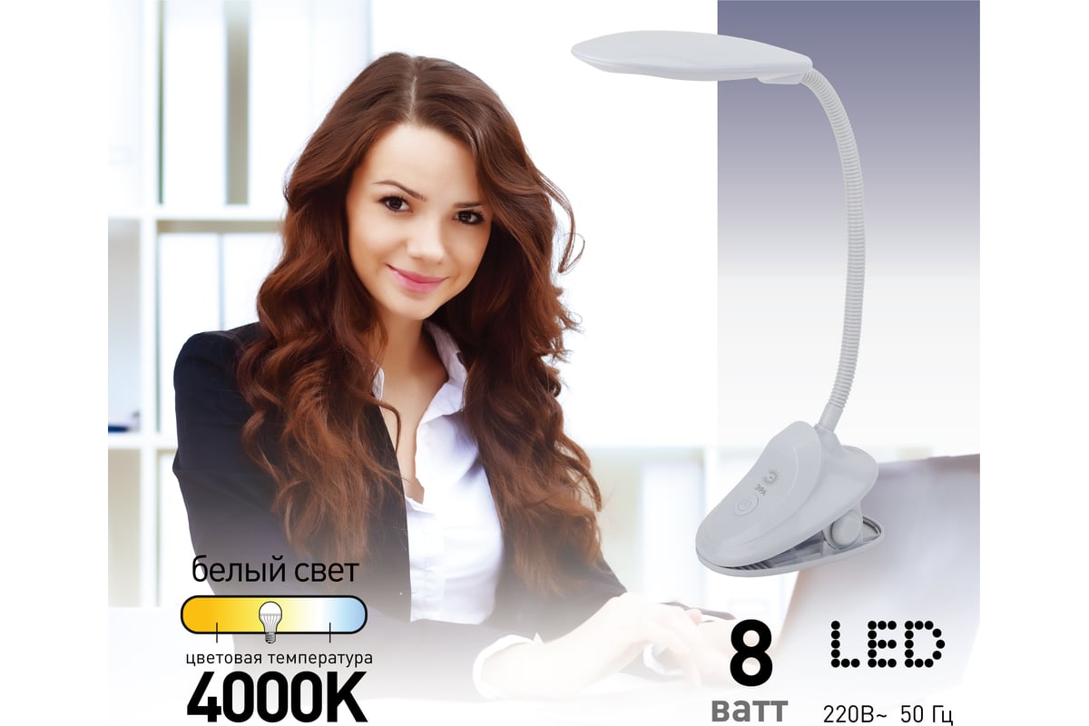 Настольный светильник ЭРА NLED-478-8W-W белый с синим Б0041093 со светодиодами (LED) в качестве источников света. У светильника выключатель на основании. Это базовая модель с оптимальным универсальным дизайном хорошей для работы за столом высоты. Гибкая стойка позволяет выбирать наиболее комфортное направление света.