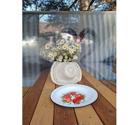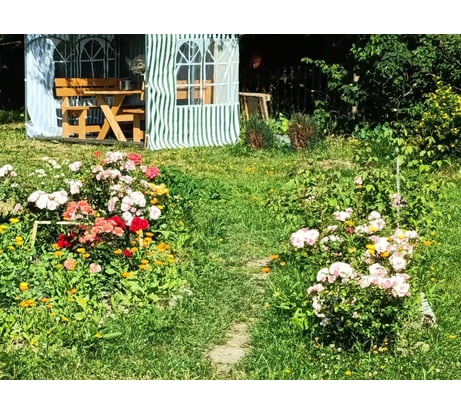 Покупали для свадебного шатра. Легко драпируется. Получилось красиво. Сейчас используем как беседку. Хорошо вписалась под соснами напротив дома