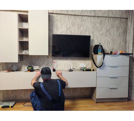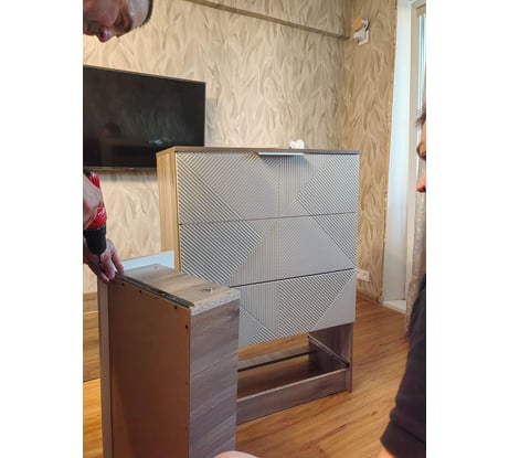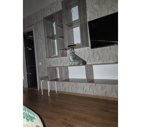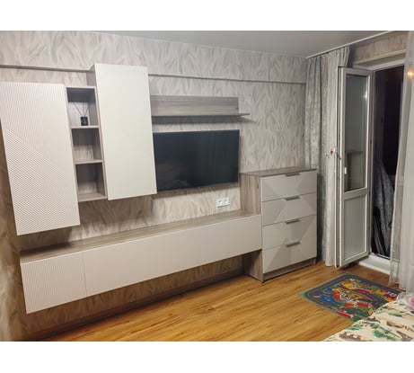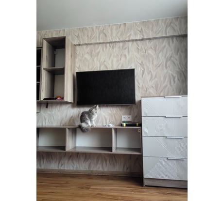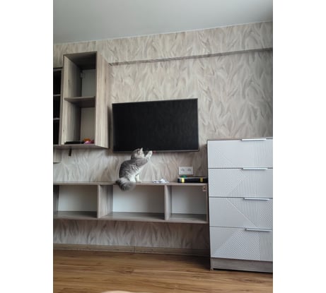 За эти деньги прекрасный гарнитур. Брали ещё высокий комод и навесную тумбу. В магазинах такая красота может стоить в 2 раза дороже минимум. Доставка в срок и без единого изъяна. Шкафчики с полкой было собирать проще всего.Покупали ещё тумбу и высокий комод. Есть огромное желание купить ещё одну тумбу и повесить её, как антрисоль над тв вместо полки, но боюсь зрительного перегруза.Подумаю. Цвет фасадов очень похож на NCS: S 2005-y50r (не точно, на мой взгляд). На фото телевизор шириной 96 см (не диагональ).