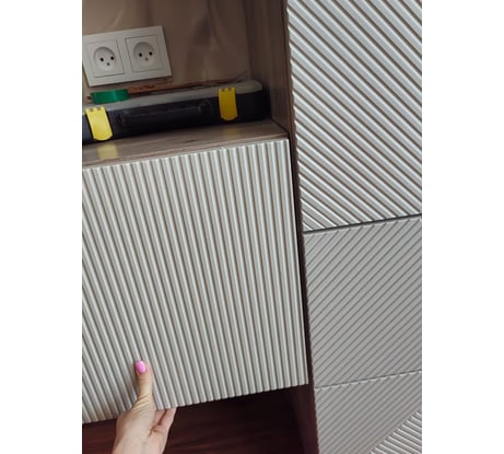За эти деньги прекрасный гарнитур. Брали ещё высокий комод и навесные шкафчики с полкой. В магазинах такая красота может стоить в 2 раза дороже минимум. Доставка в срок и без единого изъяна. К тумбе на среднюю дверцу поставили два больших магнитных замка чтобы ребёнок не открыл. Тумбу так же можно перевернуть и повесить под потолок как антрисоль (газлифт в таком случае нужно будет менять на верхнее открывание, но и эти на нижнее открывание тоже менять. Не выполняют свою функцию). Крепёж к стене тоже добавляли свой на всякий случай. Цвет фасадов очень похож на NCS: S 2005-y50r (не точно, на мой взгляд). На фото телевизор шириной 96 см (не диагональ)