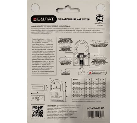 Технические характеристики навесного замка БУЛАТ нержавеющая сталь; 7 мм
