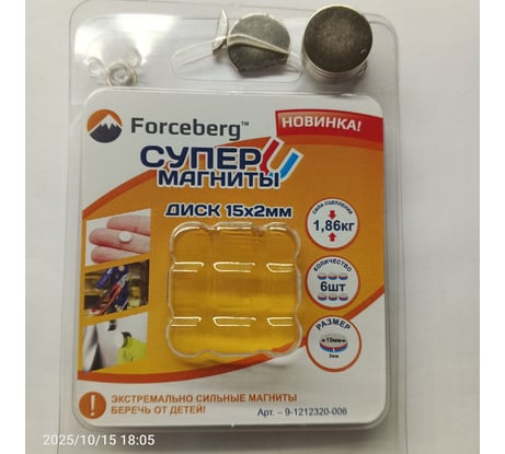 Неодимовый магнит - диск 15х2мм Forceberg 9-1212320-006 - набор из шести элементов, изготовленных из сплава бора, железа и неодима, имеющих дополнительное защитное гальваническое покрытие на базе никеля. Оно защищает магниты от негативного воздействия влажной среды, а также резких перепадов температур окружающей среды (от -60 до +80 градусов).