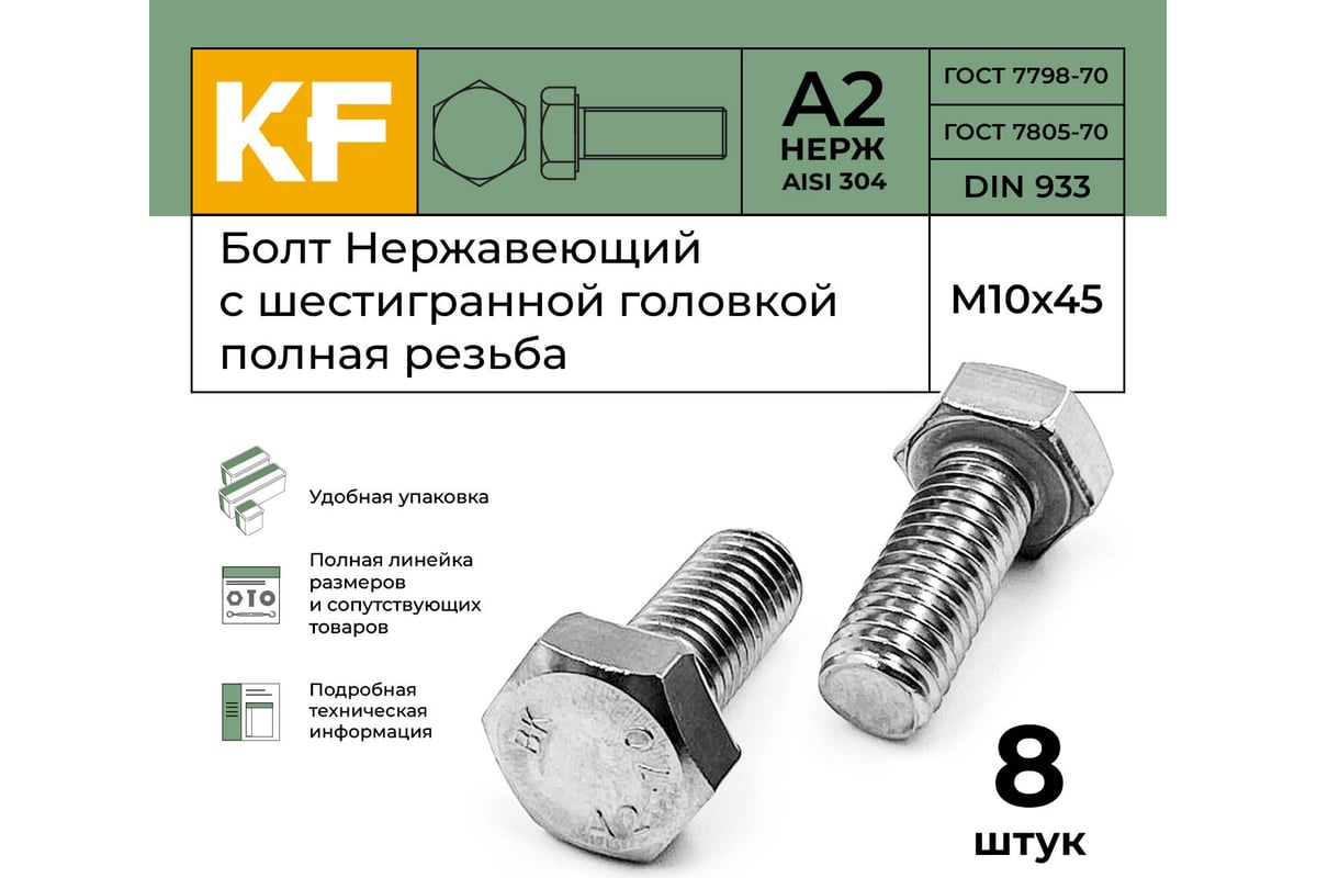 Вопросы и ответы о болте KREPFIELD нержавеющий M10x45 мм DIN 933 А2 с шестигранной головкой полная резьба 8 933А2БОЛТ10Х45-8
